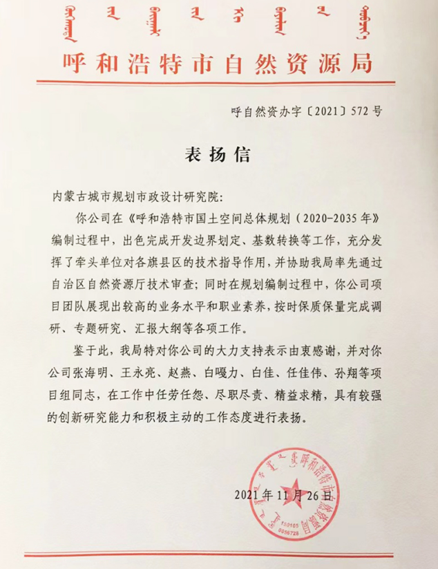 近日,呼和浩特市自然資源局向我院發(fā)來表揚信,對我院參與編制《呼和浩特市國土空間總體規(guī)劃(2020-2035年)》項目組成員展現出的較高業(yè)務水平和職業(yè)素養(yǎng)給予充分肯定和表揚。